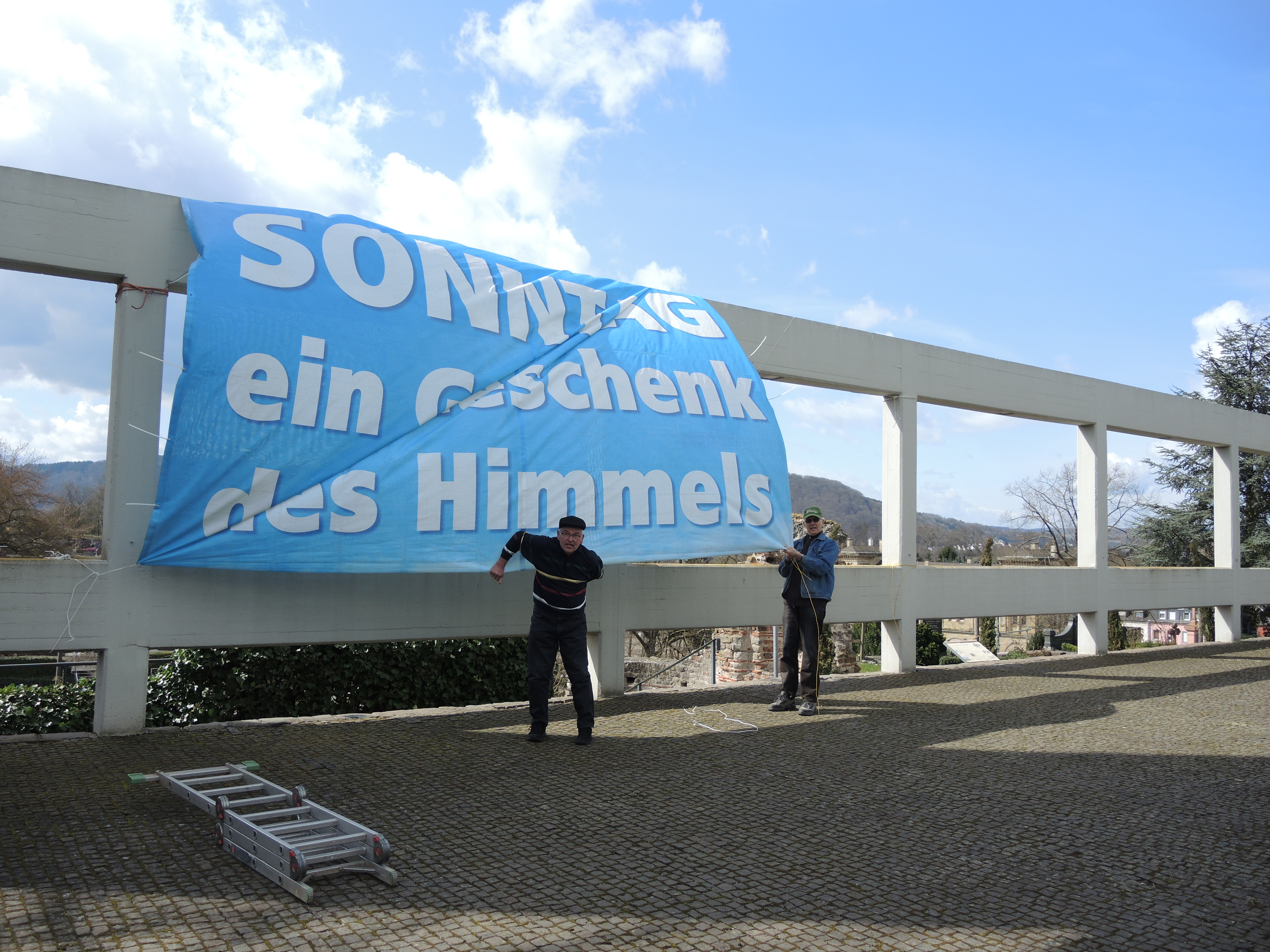 „Der freie Sonntag ist ein Geschenk des Himmels und daran halten wir fest“ – an diesem Bekenntnis ließen Karl Clemens und Hubert Kaiser vom Vorstand des KAB- Orts-verbandes St. Konz keinen Zweifel. An der Pfarrkirche St. Nikolaus brachten Sie das große Transparent der bundesweiten „Allianz für den freien Sonntag“ an, weil der Palm- sonntag 2015 in Konz verkaufsoffener Sonntag war und der KAB-Ortsverband die Bevölkerung für die Unverzichtbarkeit des arbeits- und konsumfreien Sonntags sensibilisieren wollte. „Ob Gottesdienst, Sportveranstaltung, Wanderung, Familien-treffen oder Lesen, der freie Sonntag gibt uns Zeit, abzuschalten und für die Woche aufzu-tanken“, so der Vorsitzende der KAB Konz, Karl Clemens.
